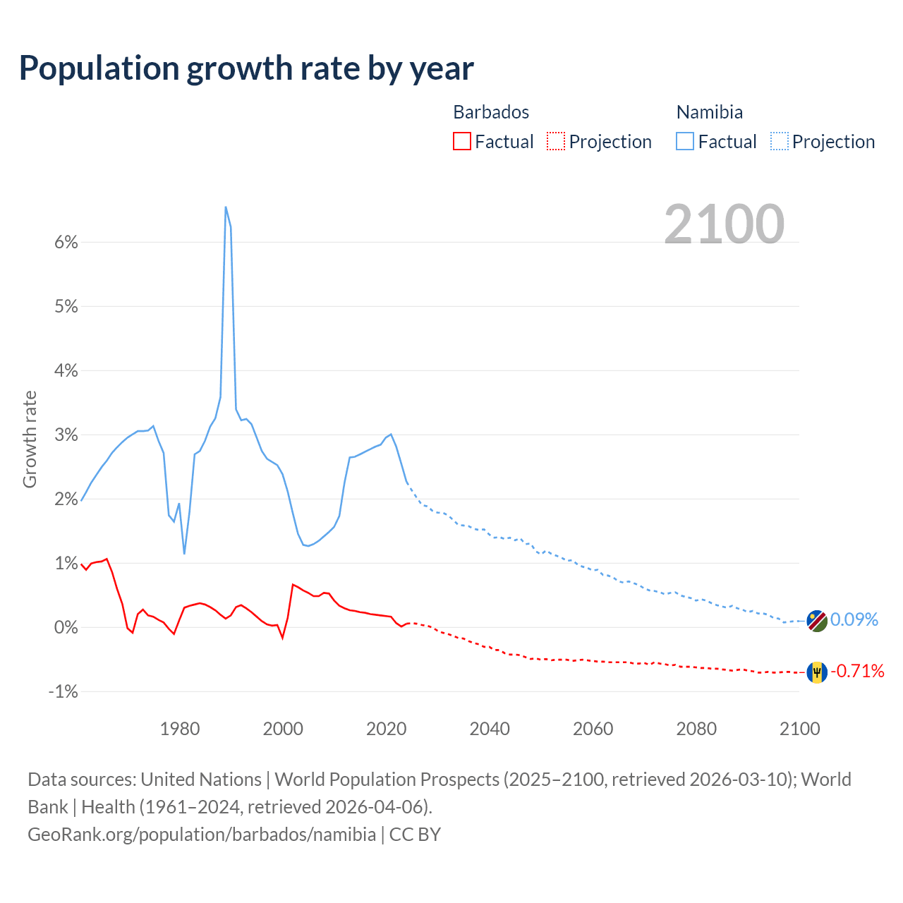 - For the last 10 years, Barbados has had an average growth rate of +0.16% per year vs +2.73% in Namibia.