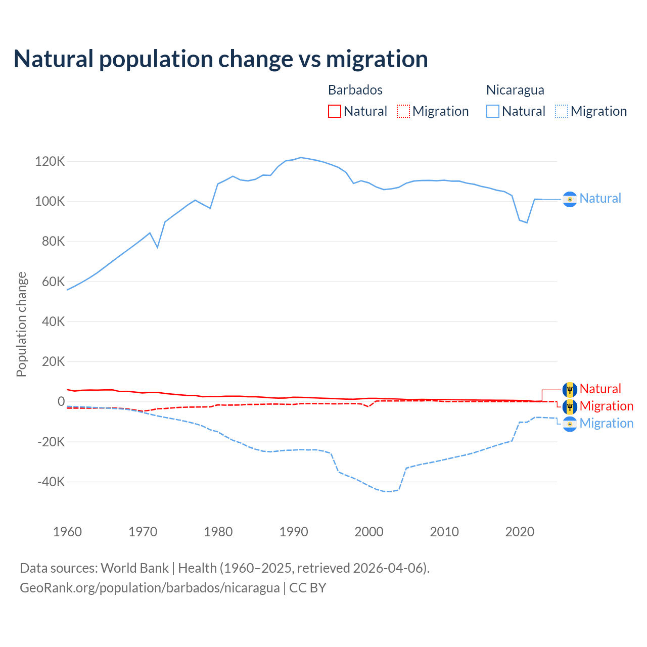 Over the last 10 years, 89.5% of the population change in Barbados is from natural causes (a gain of 4,936 people) and 10.5% is from migration (a loss of 578 people). In Nicaragua 85.5% is from natural causes (a gain of 1,017,084 people) and 14.5% is from migration (a loss of 172,078 people).