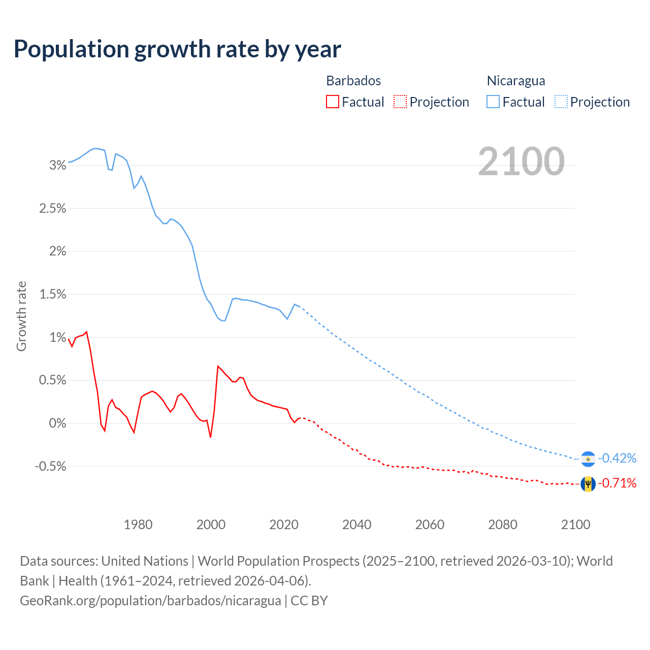 - For the last 10 years, Barbados has had an average growth rate of +0.16% per year vs +1.33% in Nicaragua.