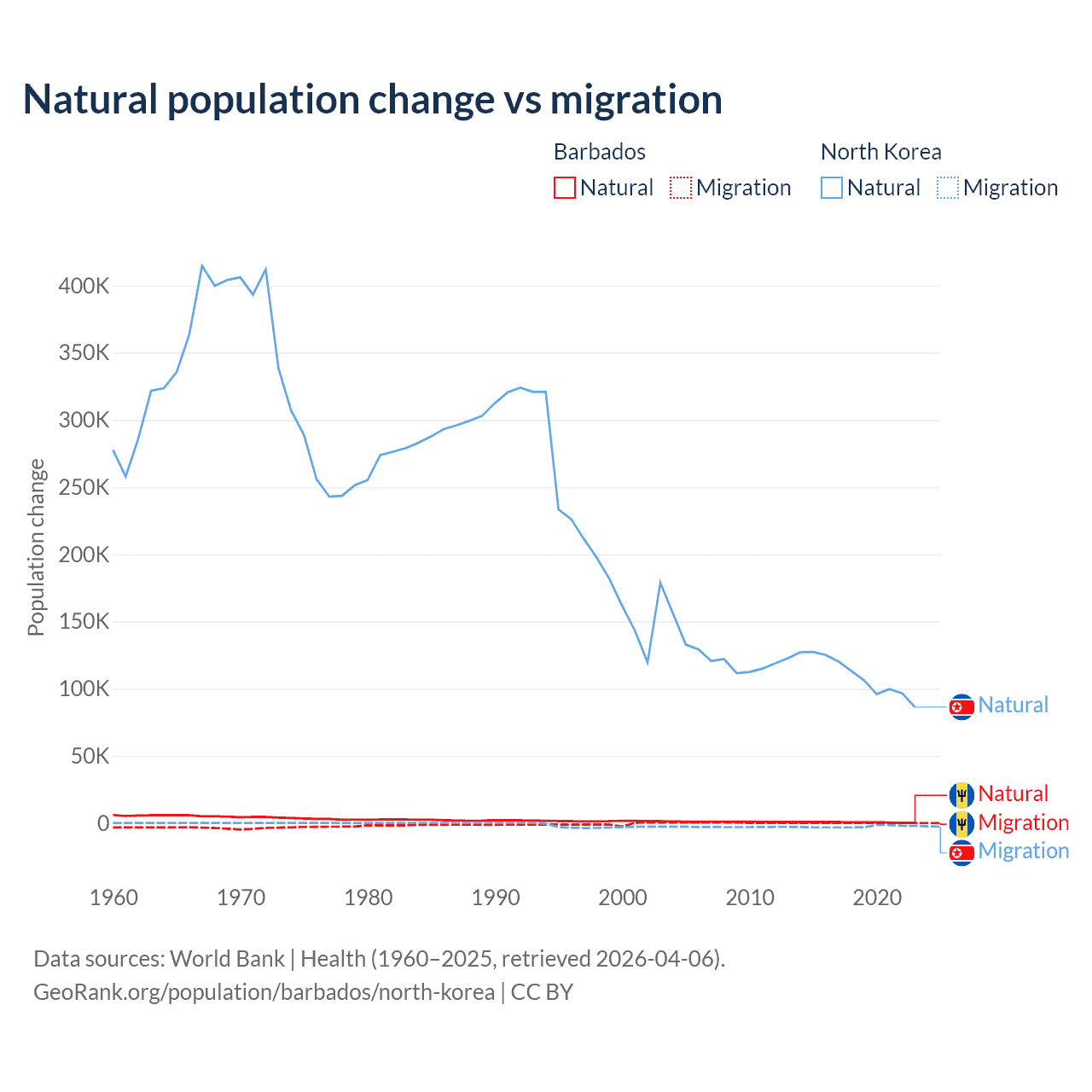 Over the last 10 years, 89.5% of the population change in Barbados is from natural causes (a gain of 4,936 people) and 10.5% is from migration (a loss of 578 people). In North Korea 97.7% is from natural causes (a gain of 1,097,372 people) and 2.33% is from migration (a loss of 26,227 people).