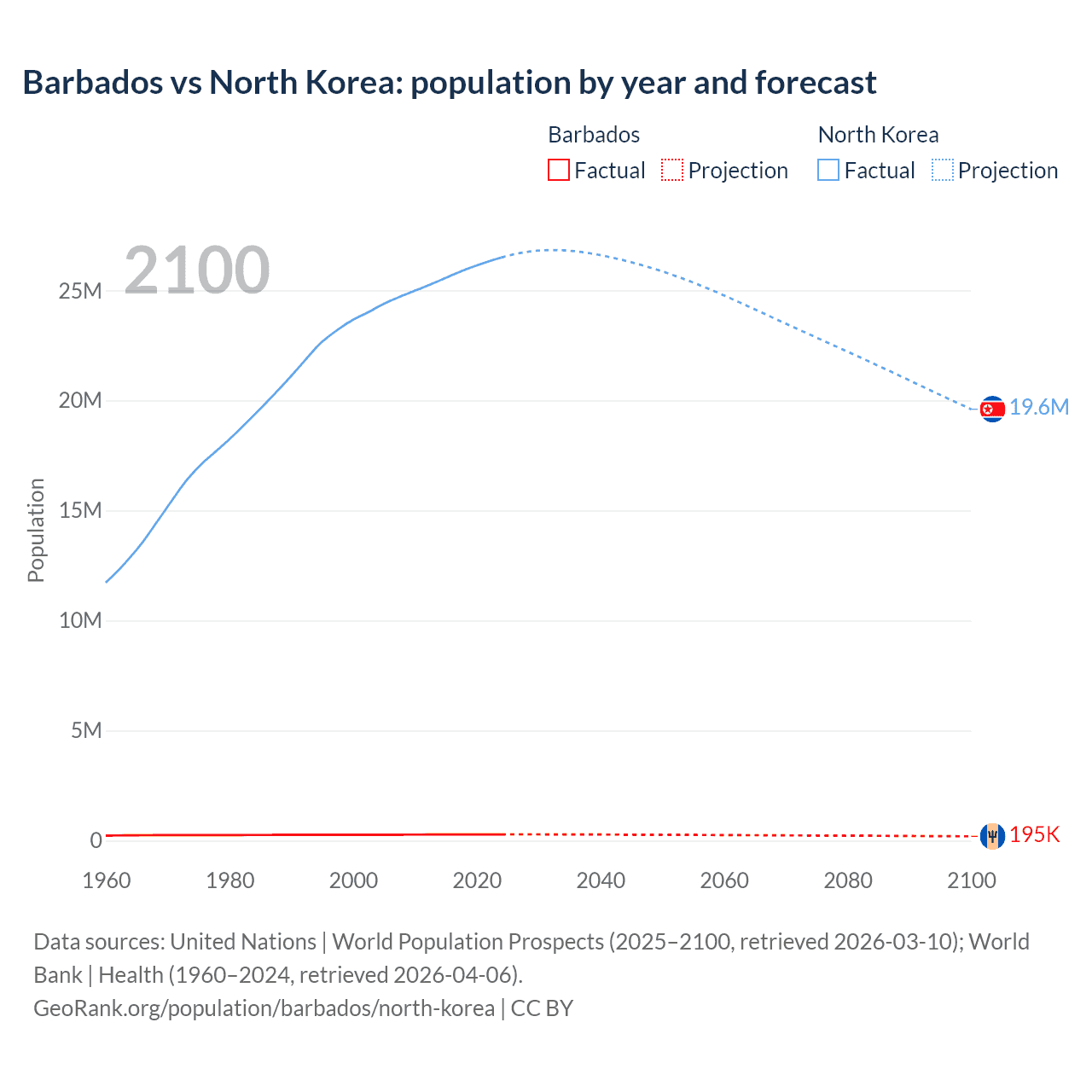 The latest officially reported population of Barbados was 282,467 in 2024 vs 26,498,823 people in North Korea in 2024. In 2026, based on the adjusted UN estimation, the current Barbados' population is 282,798 people compared to 26,659,144 in North Korea.
