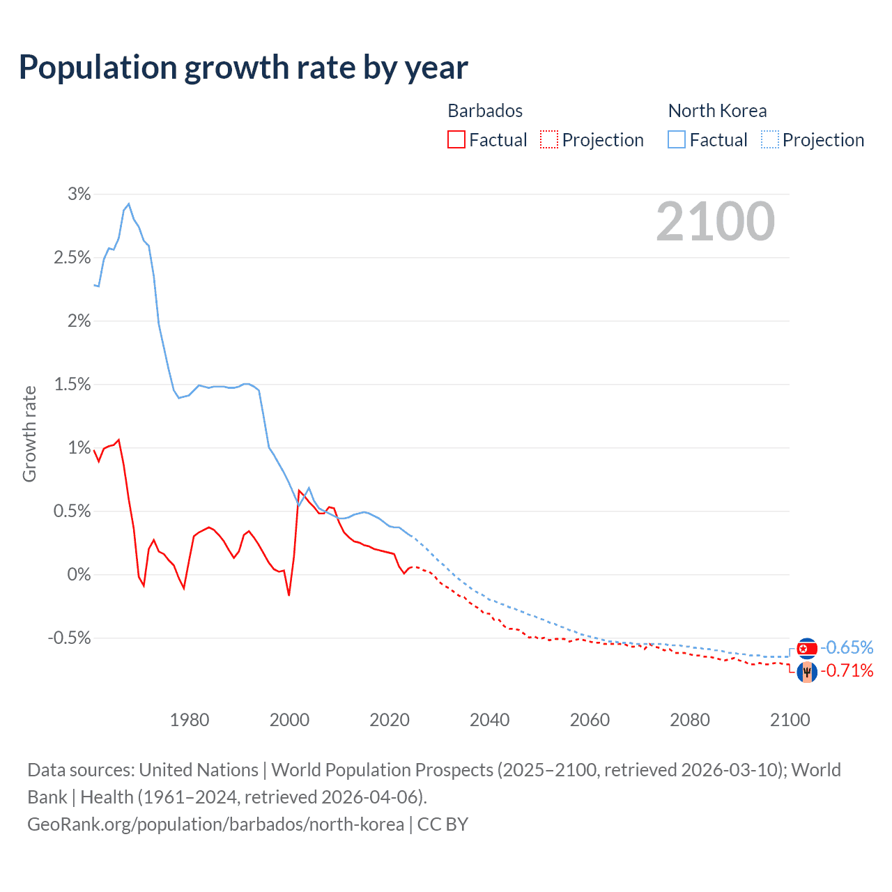- For the last 10 years, Barbados has had an average growth rate of +0.16% per year vs +0.41% in North Korea.