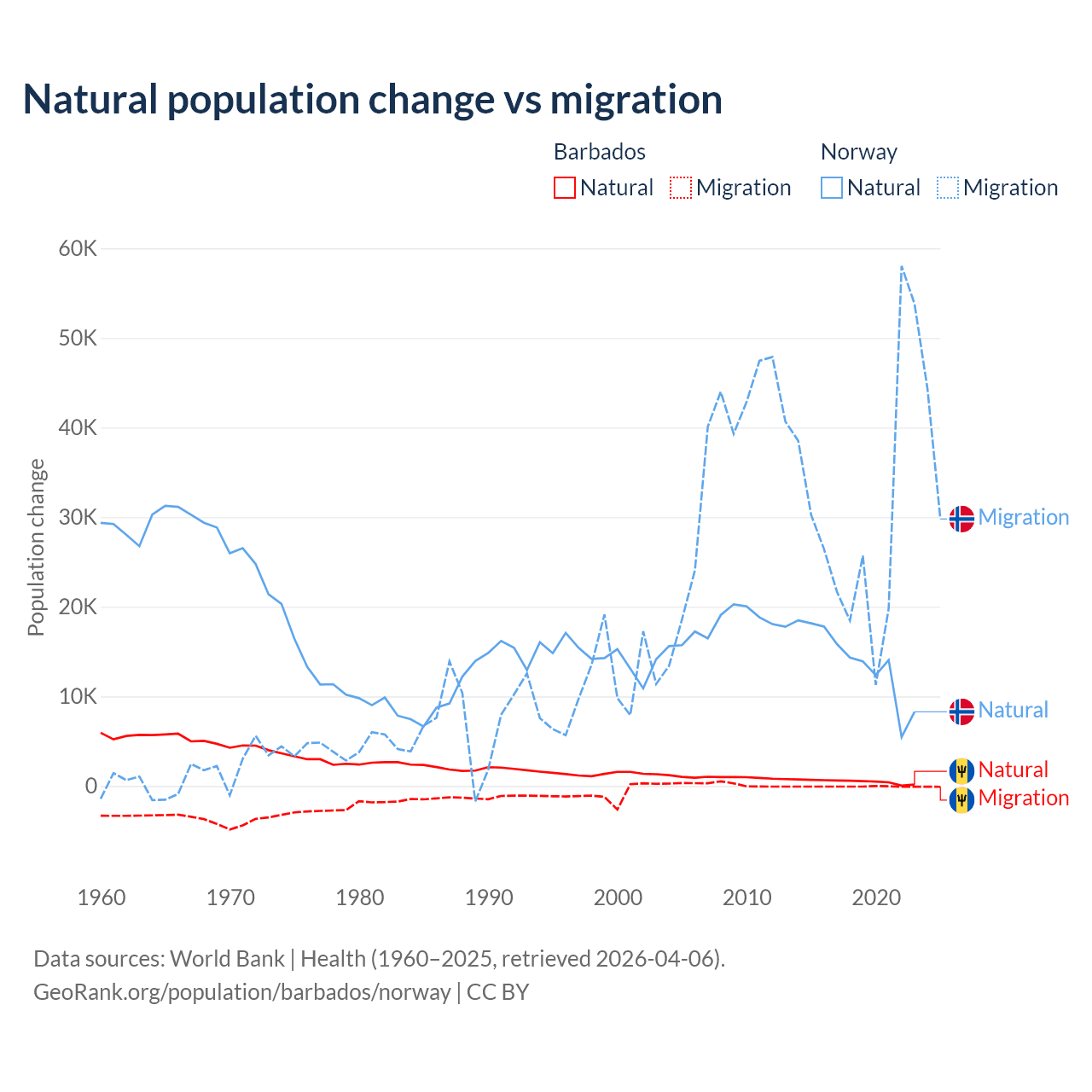 Over the last 10 years, 89.5% of the population change in Barbados is from natural causes (a gain of 4,936 people) and 10.5% is from migration (a loss of 578 people). In Norway 31.3% is from natural causes (a gain of 138,699 people) and 68.7% is from migration (a gain of 303,945 people).