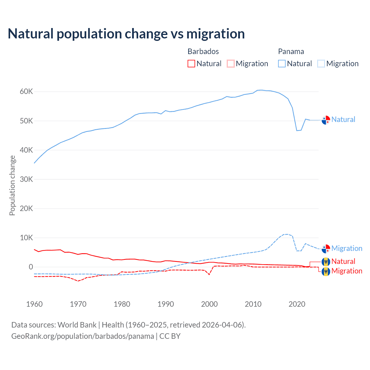 Over the last 10 years, 89.5% of the population change in Barbados is from natural causes (a gain of 4,936 people) and 10.5% is from migration (a loss of 578 people). In Panama 86.5% is from natural causes (a gain of 544,211 people) and 13.5% is from migration (a gain of 84,849 people).