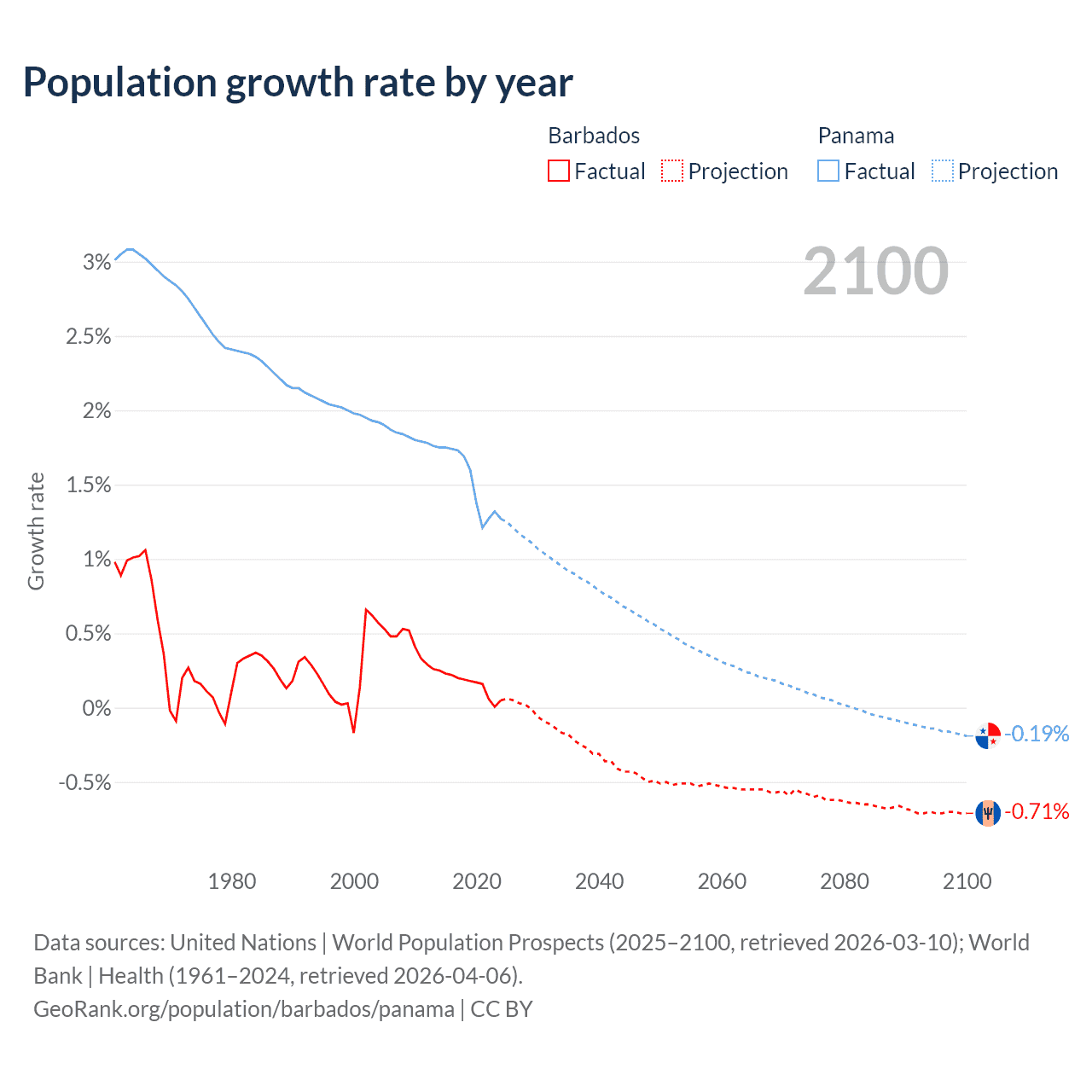 - For the last 10 years, Barbados has had an average growth rate of +0.16% per year vs +1.52% in Panama.