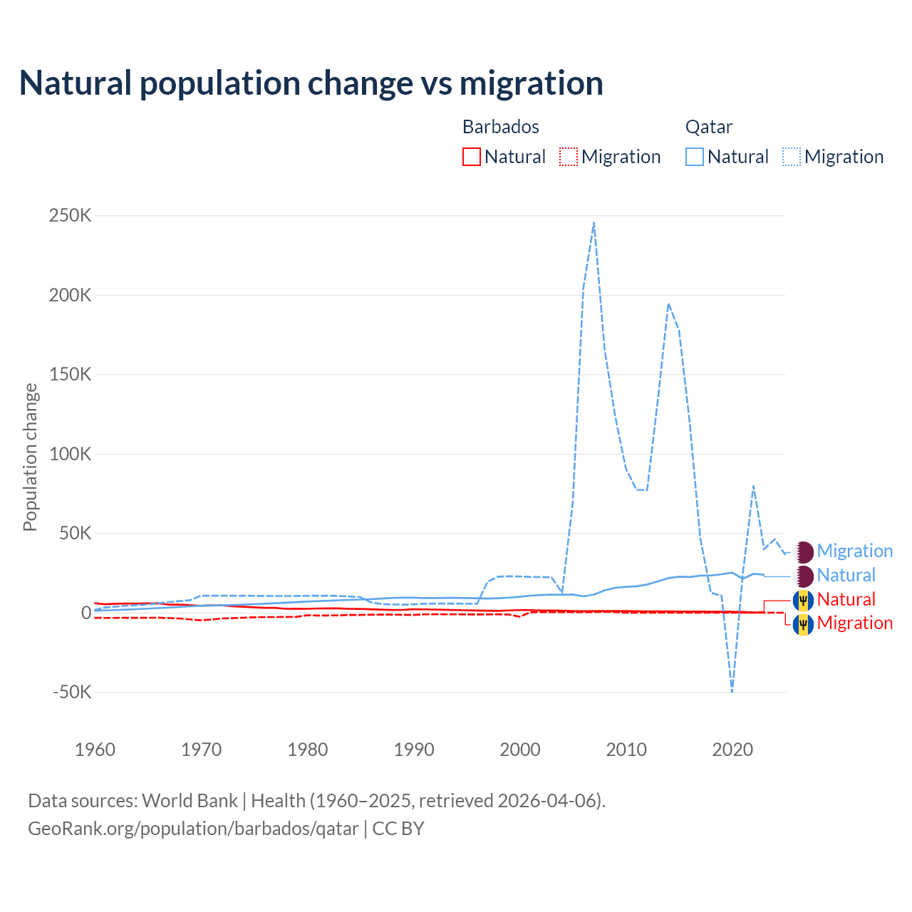 Over the last 10 years, 89.5% of the population change in Barbados is from natural causes (a gain of 4,936 people) and 10.5% is from migration (a loss of 578 people). In Qatar 26.1% is from natural causes (a gain of 232,009 people) and 73.9% is from migration (a gain of 655,712 people).
