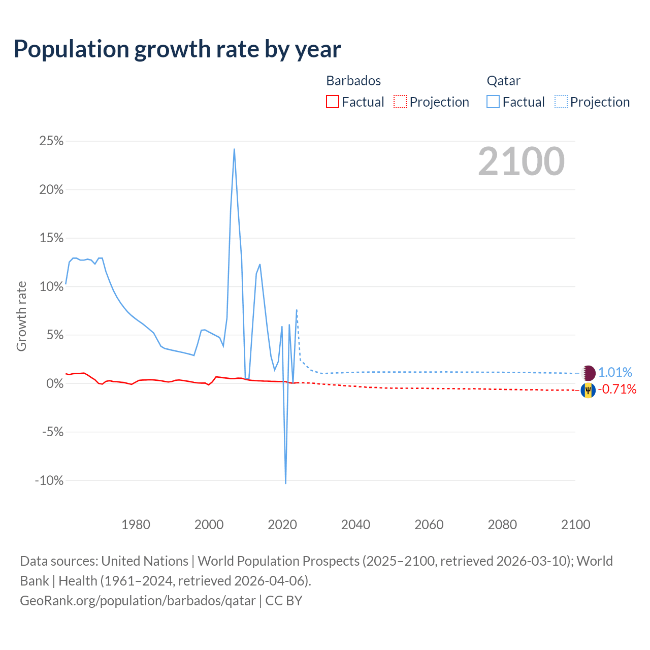 - For the last 10 years, Barbados has had an average growth rate of +0.16% per year vs +3.86% in Qatar.