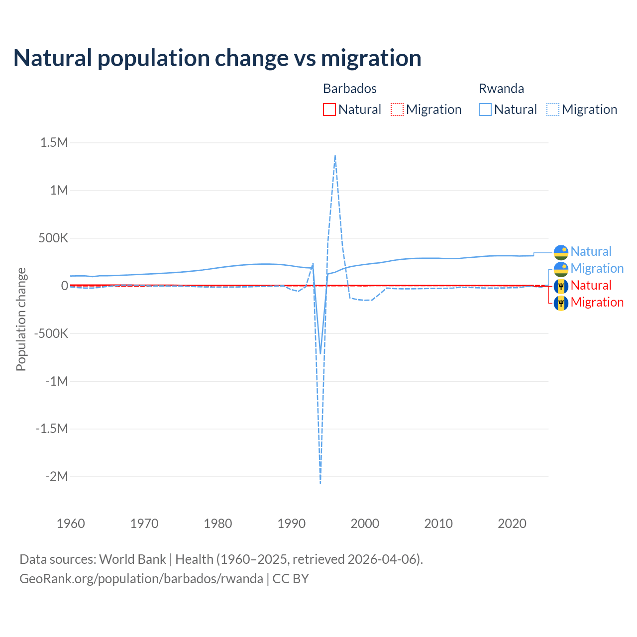 Over the last 10 years, 89.5% of the population change in Barbados is from natural causes (a gain of 4,936 people) and 10.5% is from migration (a loss of 578 people). In Rwanda 93.8% is from natural causes (a gain of 3,081,296 people) and 6.18% is from migration (a loss of 203,035 people).