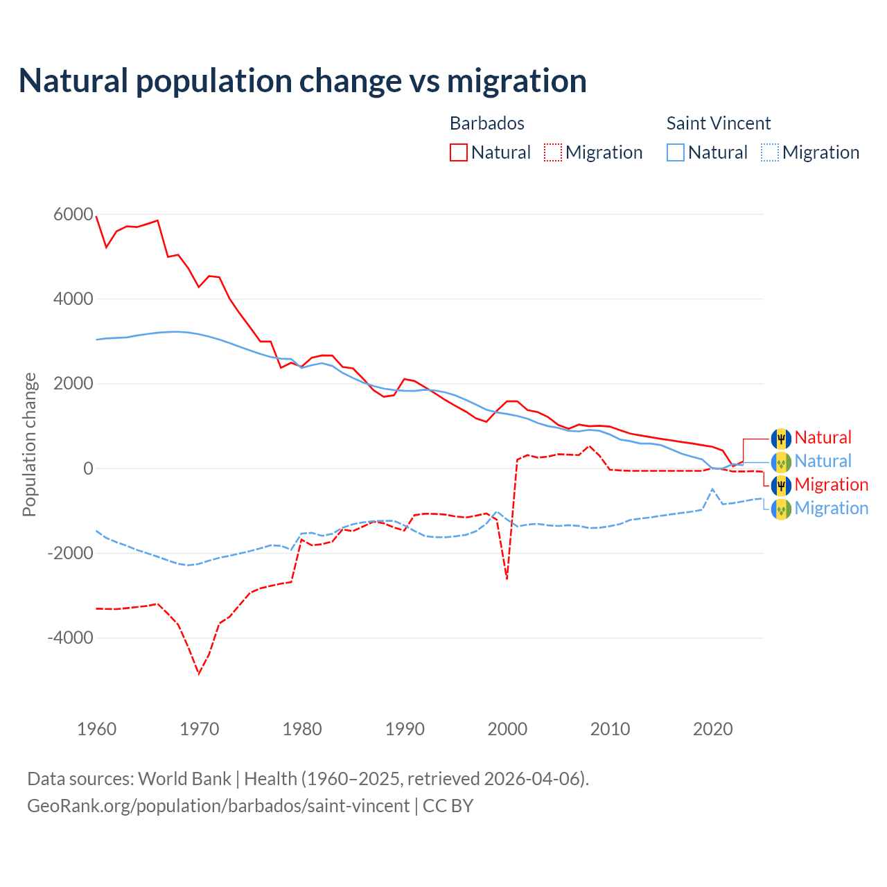 Over the last 10 years, 89.5% of the population change in Barbados is from natural causes (a gain of 4,936 people) and 10.5% is from migration (a loss of 578 people). In Saint Vincent 21.2% is from natural causes (a gain of 2,525 people) and 78.8% is from migration (a loss of 9,393 people).