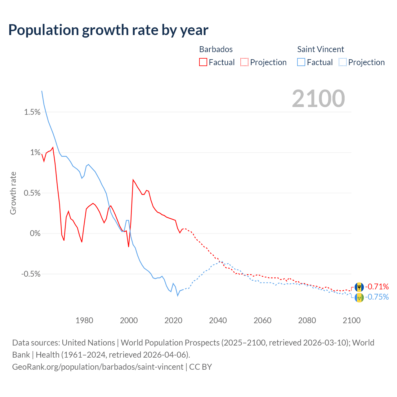 - For the last 10 years, Barbados has had an average growth rate of +0.16% per year vs -0.65% in Saint Vincent.