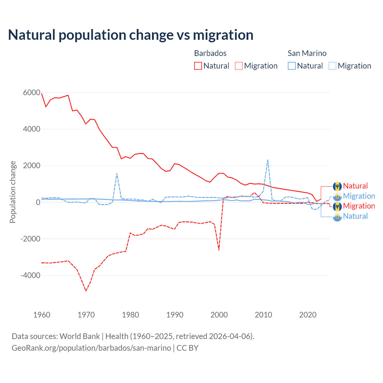 Over the last 10 years, 89.5% of the population change in Barbados is from natural causes (a gain of 4,936 people) and 10.5% is from migration (a loss of 578 people). In San Marino 40.9% is from natural causes (a loss of 358 people) and 59.1% is from migration (a gain of 517 people).