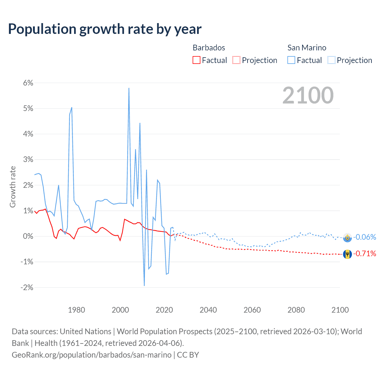 - Since 2006, the population of Barbados has increased from 270K people to 283K (4.74% growth), while San Marino has grown from 30.2K to 34K (12.5% growth).