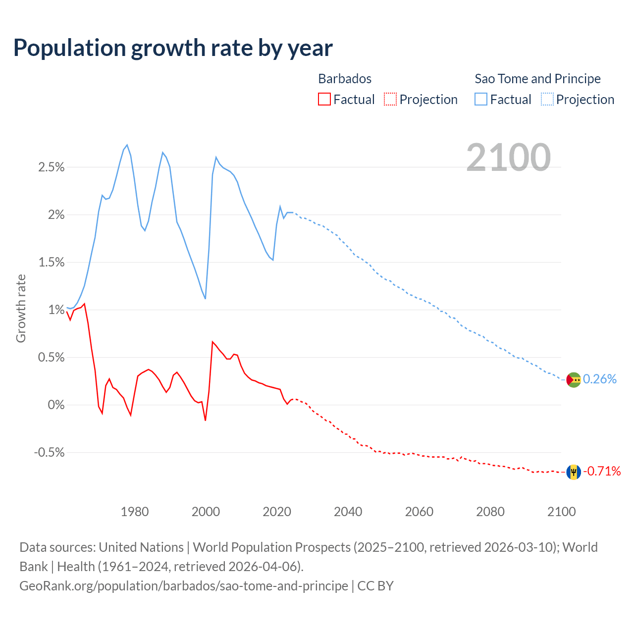 - For the last 10 years, Barbados has had an average growth rate of +0.16% per year vs +1.82% in Sao Tome and Principe.