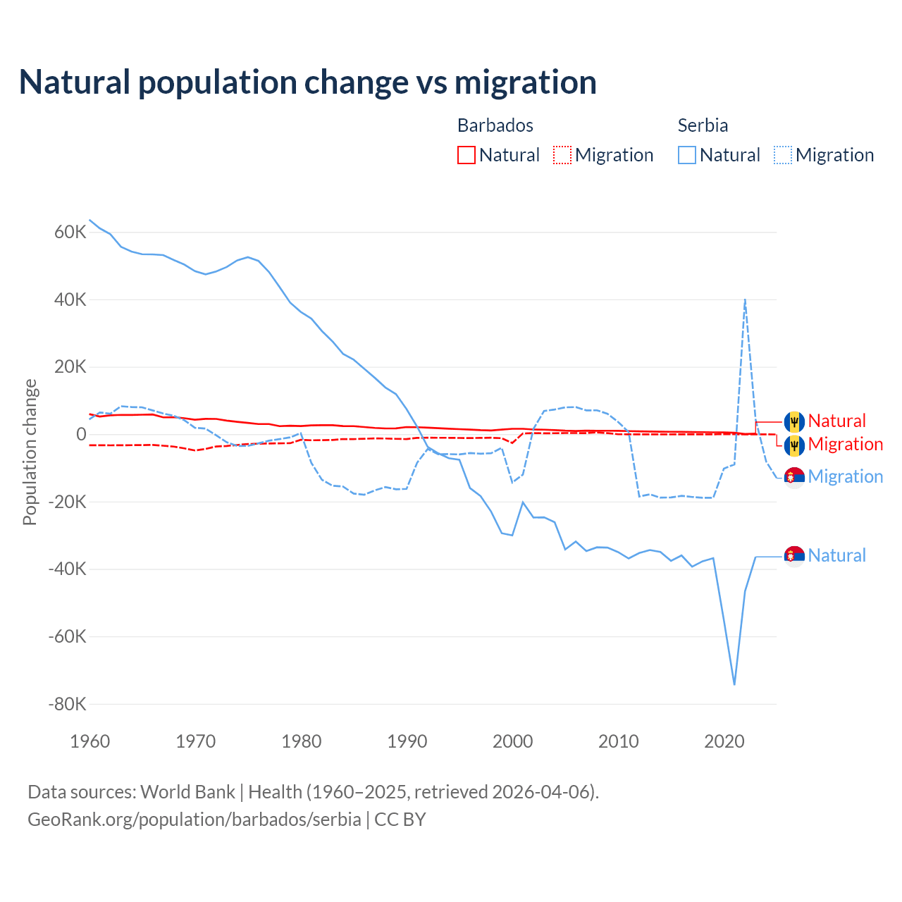 Over the last 10 years, 89.5% of the population change in Barbados is from natural causes (a gain of 4,936 people) and 10.5% is from migration (a loss of 578 people). In Serbia 83.3% is from natural causes (a loss of 435,148 people) and 16.7% is from migration (a loss of 87,110 people).