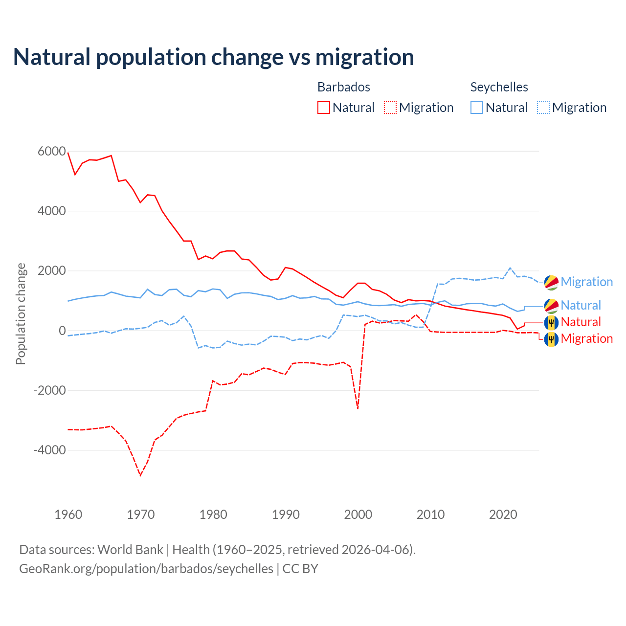Over the last 10 years, 89.5% of the population change in Barbados is from natural causes (a gain of 4,936 people) and 10.5% is from migration (a loss of 578 people). In the Seychelles 31.4% is from natural causes (a gain of 8,122 people) and 68.6% is from migration (a gain of 17,748 people).