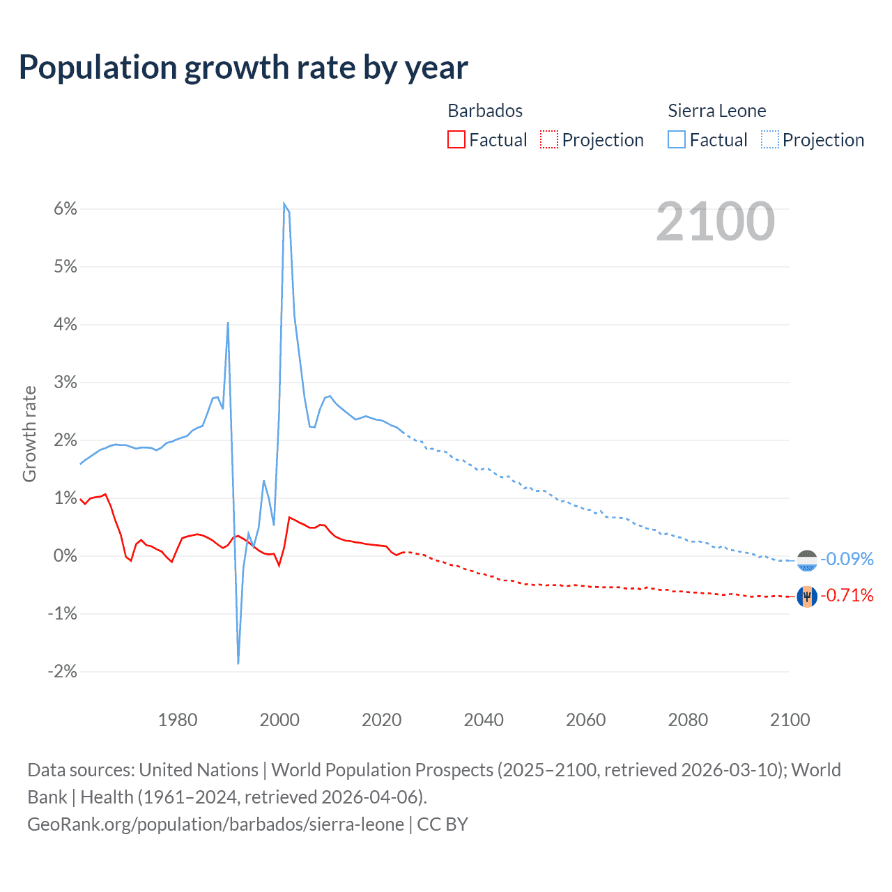 - For the last 10 years, Barbados has had an average growth rate of +0.16% per year vs +2.32% in Sierra Leone.