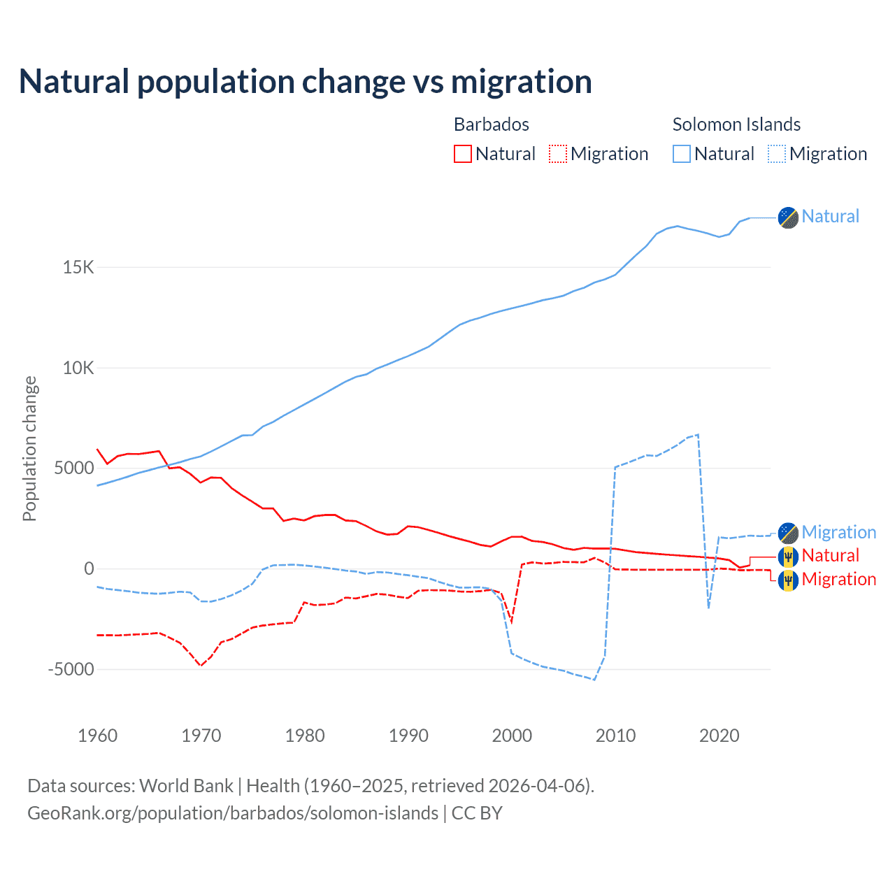 Over the last 10 years, 89.5% of the population change in Barbados is from natural causes (a gain of 4,936 people) and 10.5% is from migration (a loss of 578 people). In the Solomon Islands 82.8% is from natural causes (a gain of 168,727 people) and 17.2% is from migration (a gain of 35,031 people).