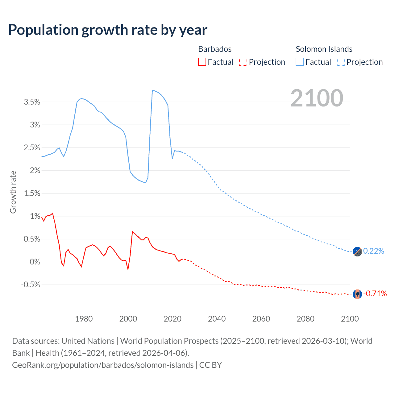 - For the last 10 years, Barbados has had an average growth rate of +0.16% per year vs +2.95% in the Solomon Islands.