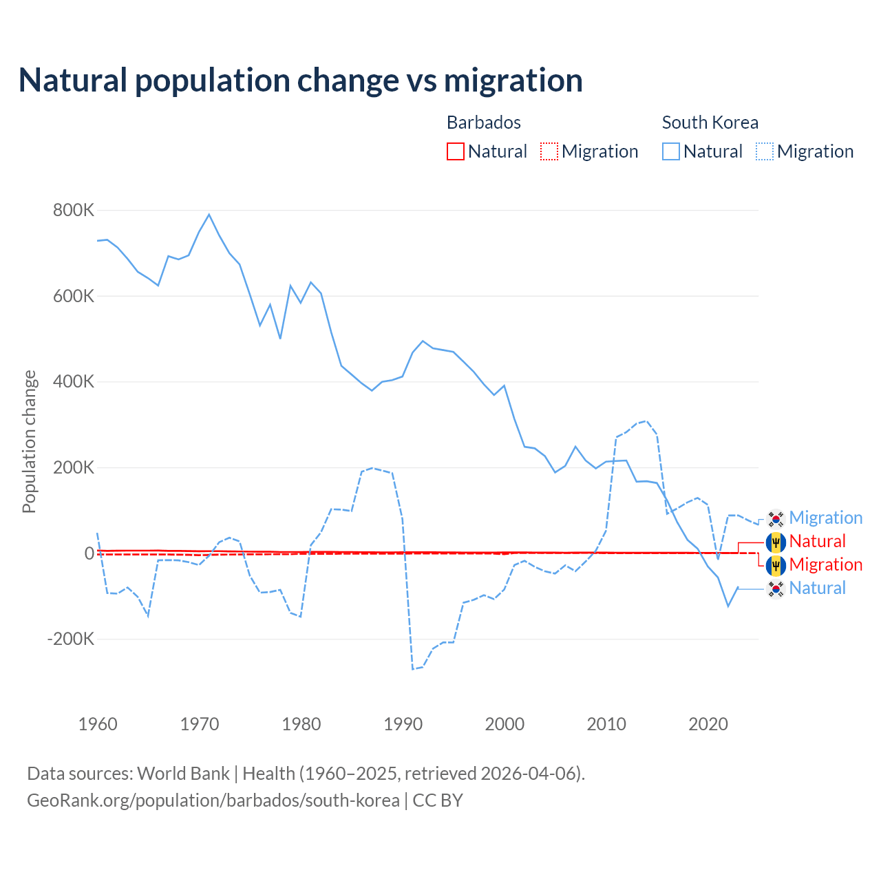 Over the last 10 years, 89.5% of the population change in Barbados is from natural causes (a gain of 4,936 people) and 10.5% is from migration (a loss of 578 people). In South Korea 17.6% is from natural causes (a gain of 277,215 people) and 82.4% is from migration (a gain of 1,298,356 people).