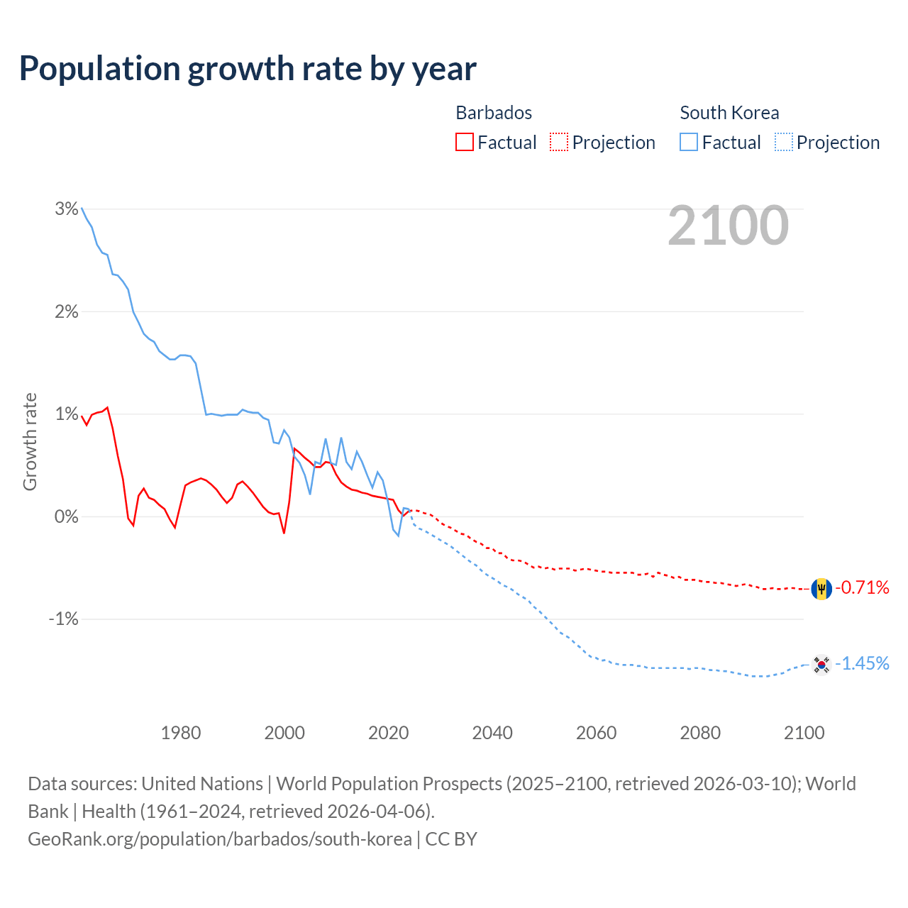 - For the last 10 years, Barbados has had an average growth rate of +0.16% per year vs +0.24% in South Korea.