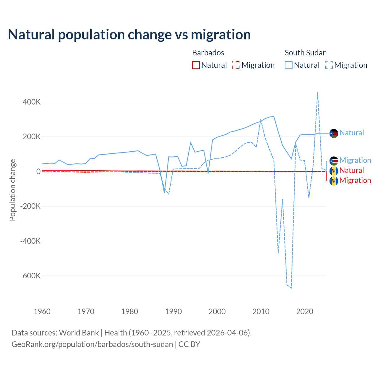 Over the last 10 years, 89.5% of the population change in Barbados is from natural causes (a gain of 4,936 people) and 10.5% is from migration (a loss of 578 people). In South Sudan 57.4% is from natural causes (a gain of 1,792,135 people) and 42.6% is from migration (a loss of 1,329,606 people).
