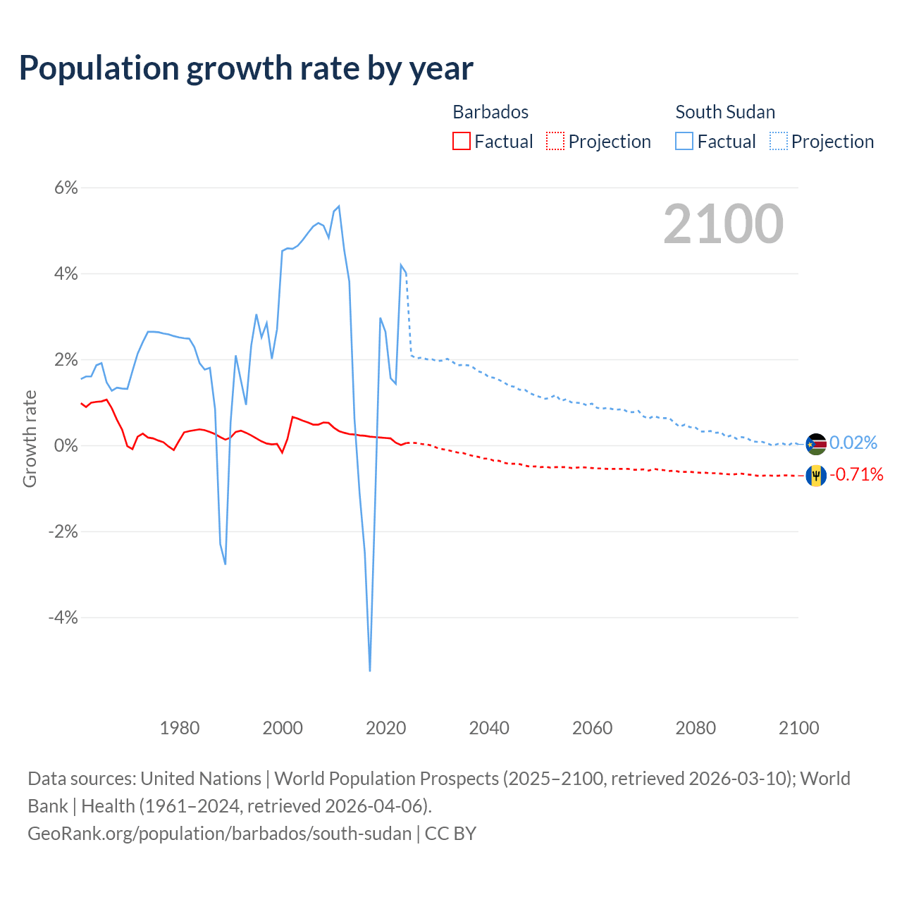 - For the last 10 years, Barbados has had an average growth rate of +0.16% per year vs +0.65% in South Sudan.