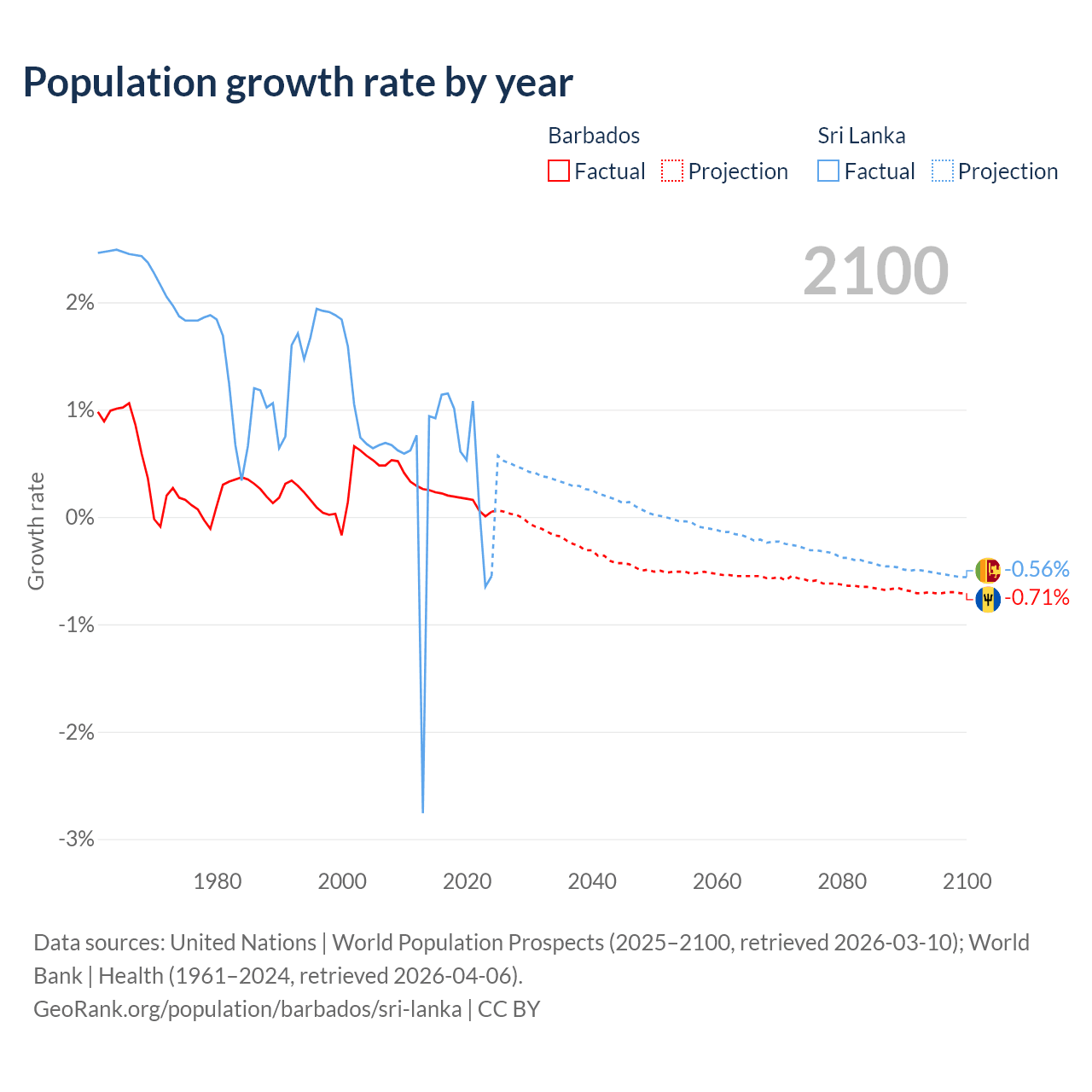 - For the last 10 years, Barbados has had an average growth rate of +0.16% per year vs +0.57% in Sri Lanka.