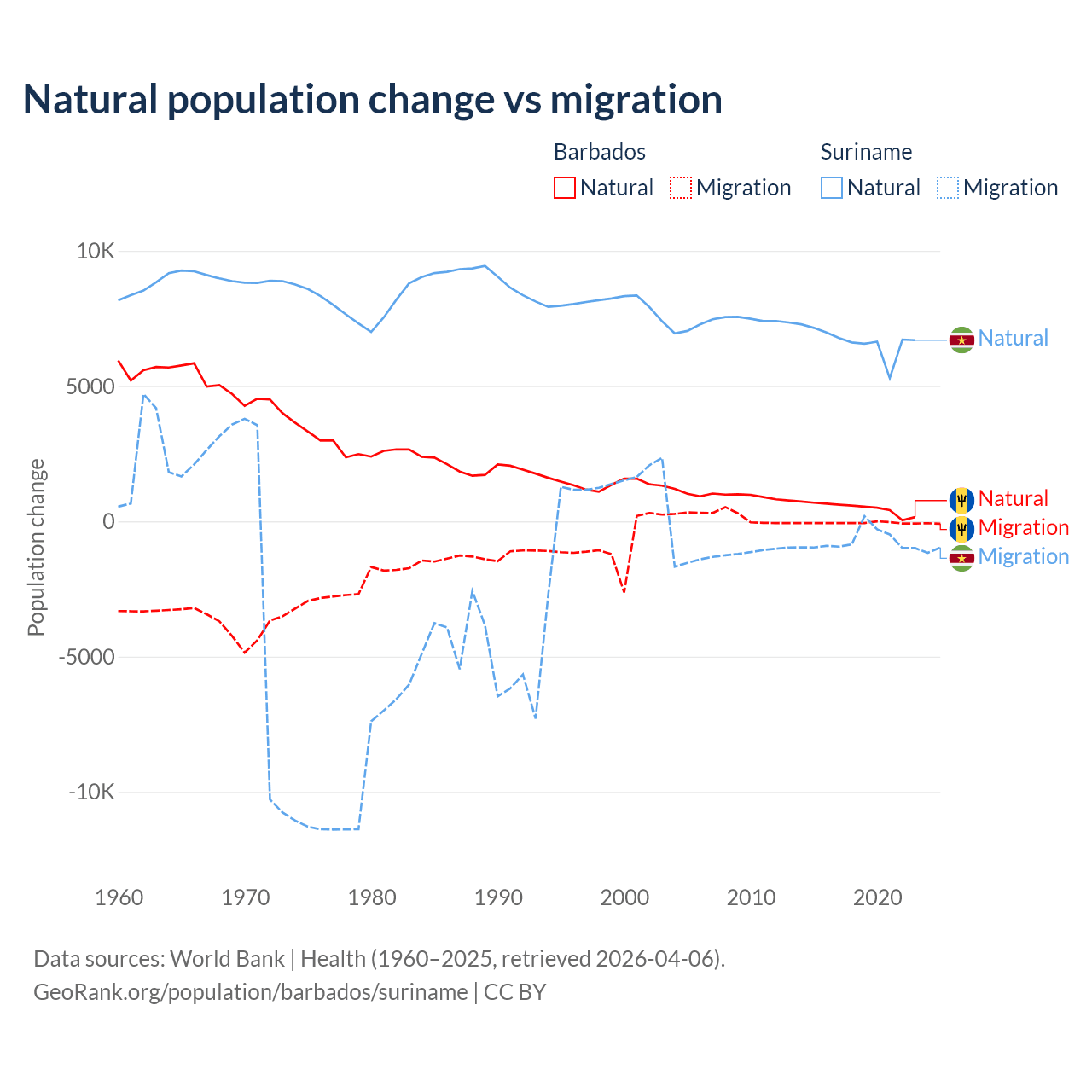 Over the last 10 years, 89.5% of the population change in Barbados is from natural causes (a gain of 4,936 people) and 10.5% is from migration (a loss of 578 people). In Suriname 90.3% is from natural causes (a gain of 66,709 people) and 9.72% is from migration (a loss of 7,185 people).