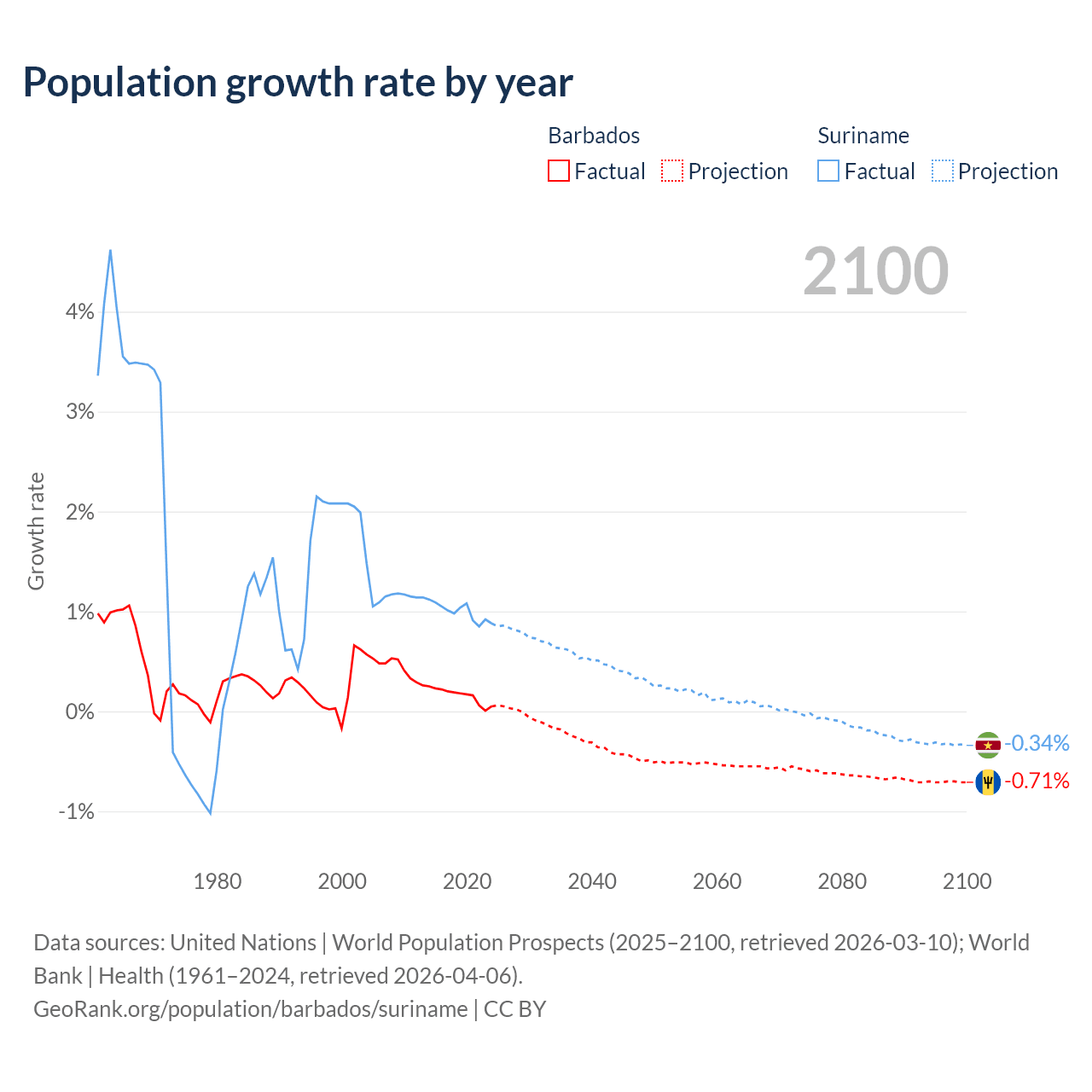 Barbados vs Suriname: population by year and forecast