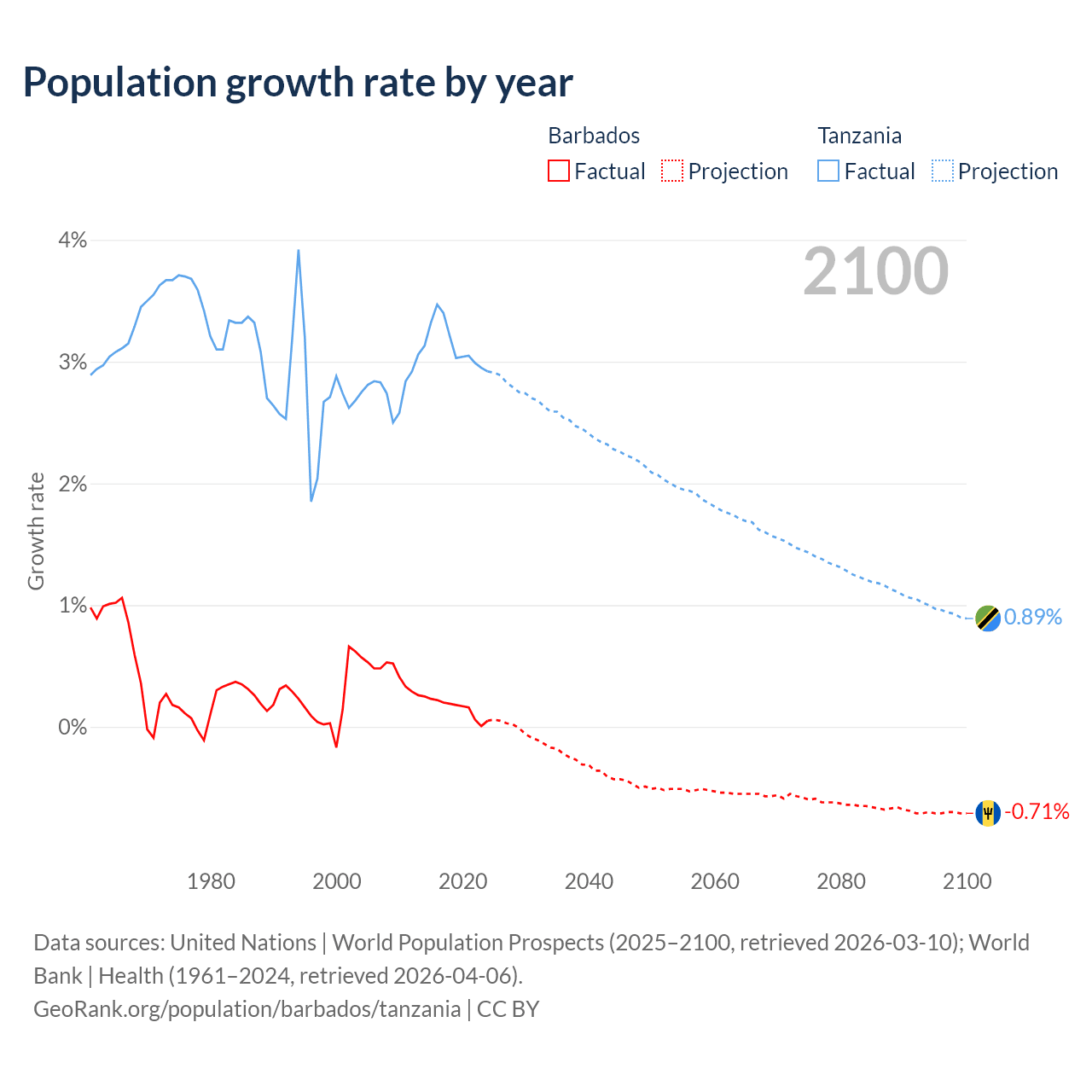 - For the last 10 years, Barbados has had an average growth rate of +0.16% per year vs +3.13% in Tanzania.