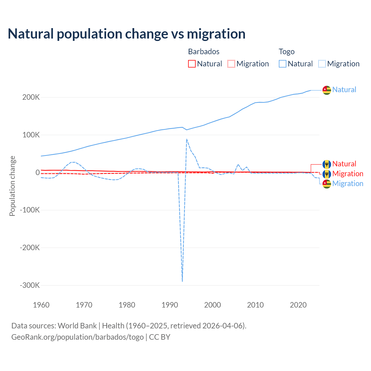 Over the last 10 years, 89.5% of the population change in Barbados is from natural causes (a gain of 4,936 people) and 10.5% is from migration (a loss of 578 people). In Togo 99.1% is from natural causes (a gain of 2,052,115 people) and 0.86% is from migration (a loss of 17,852 people).