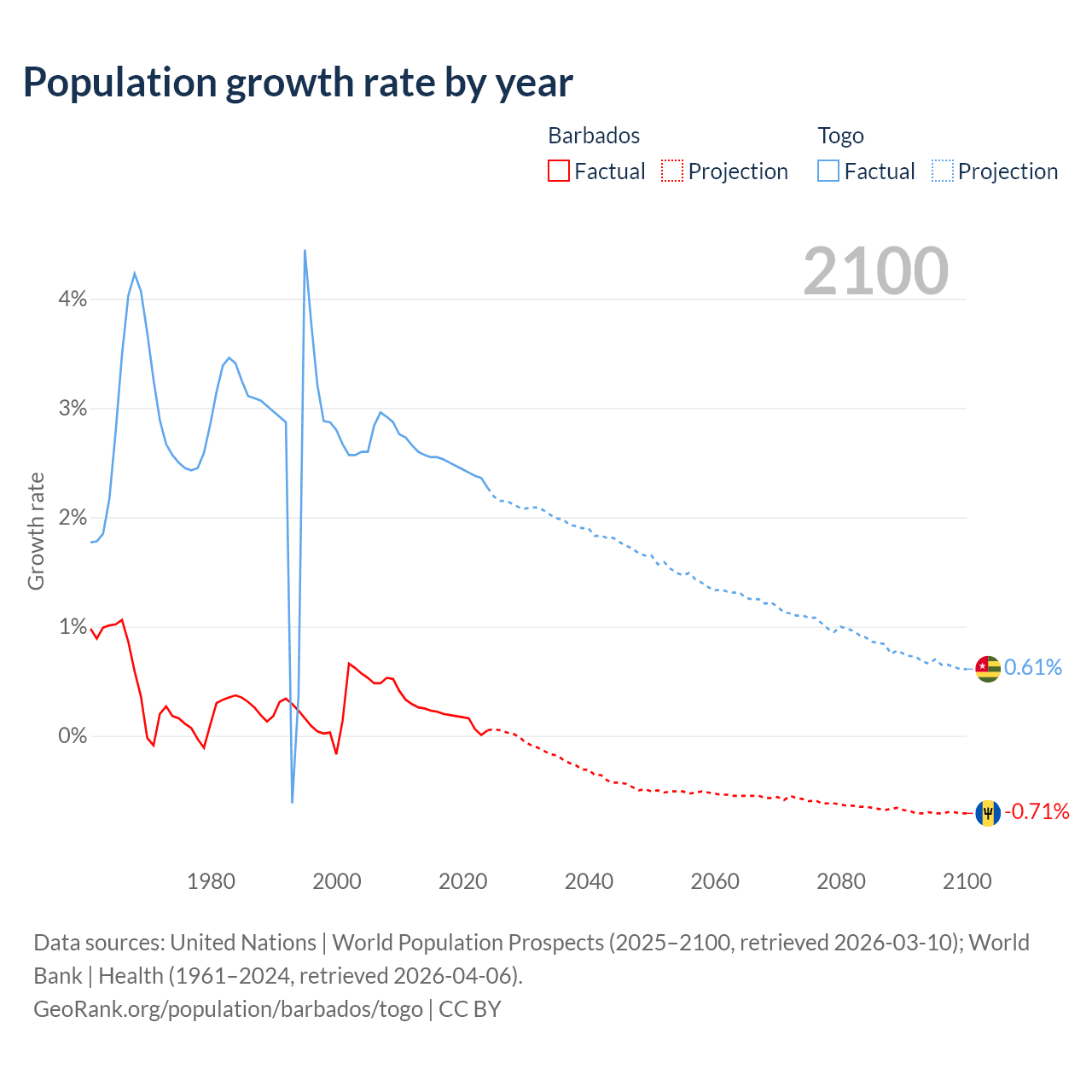 - For the last 10 years, Barbados has had an average growth rate of +0.16% per year vs +2.46% in Togo.