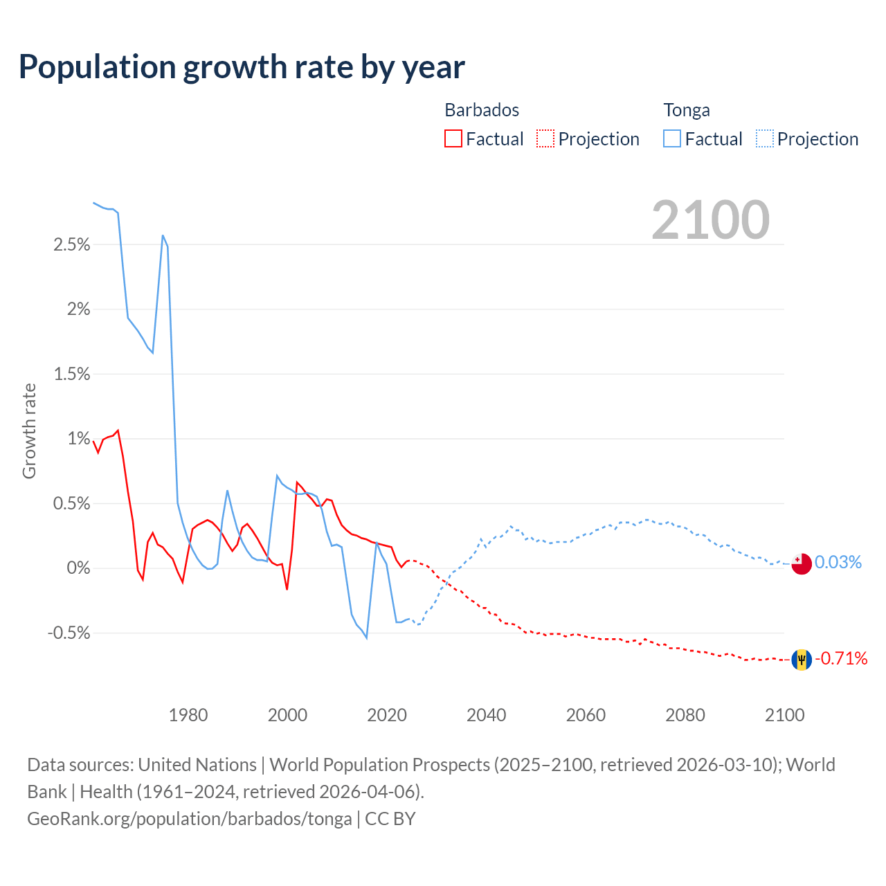 Barbados vs Tonga: population by year and forecast