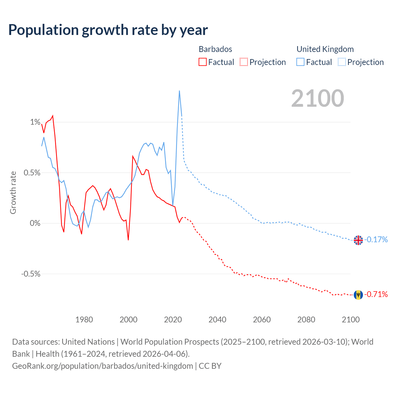 - For the last 10 years, Barbados has had an average growth rate of +0.16% per year vs +0.7% in the United Kingdom.