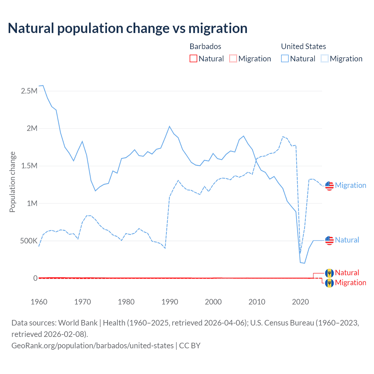 Over the last 10 years, 89.5% of the population change in Barbados is from natural causes (a gain of 4,936 people) and 10.5% is from migration (a loss of 578 people). In the United States 35.8% is from natural causes (a gain of 8,005,866 people) and 64.2% is from migration (a gain of 14,334,286 people).