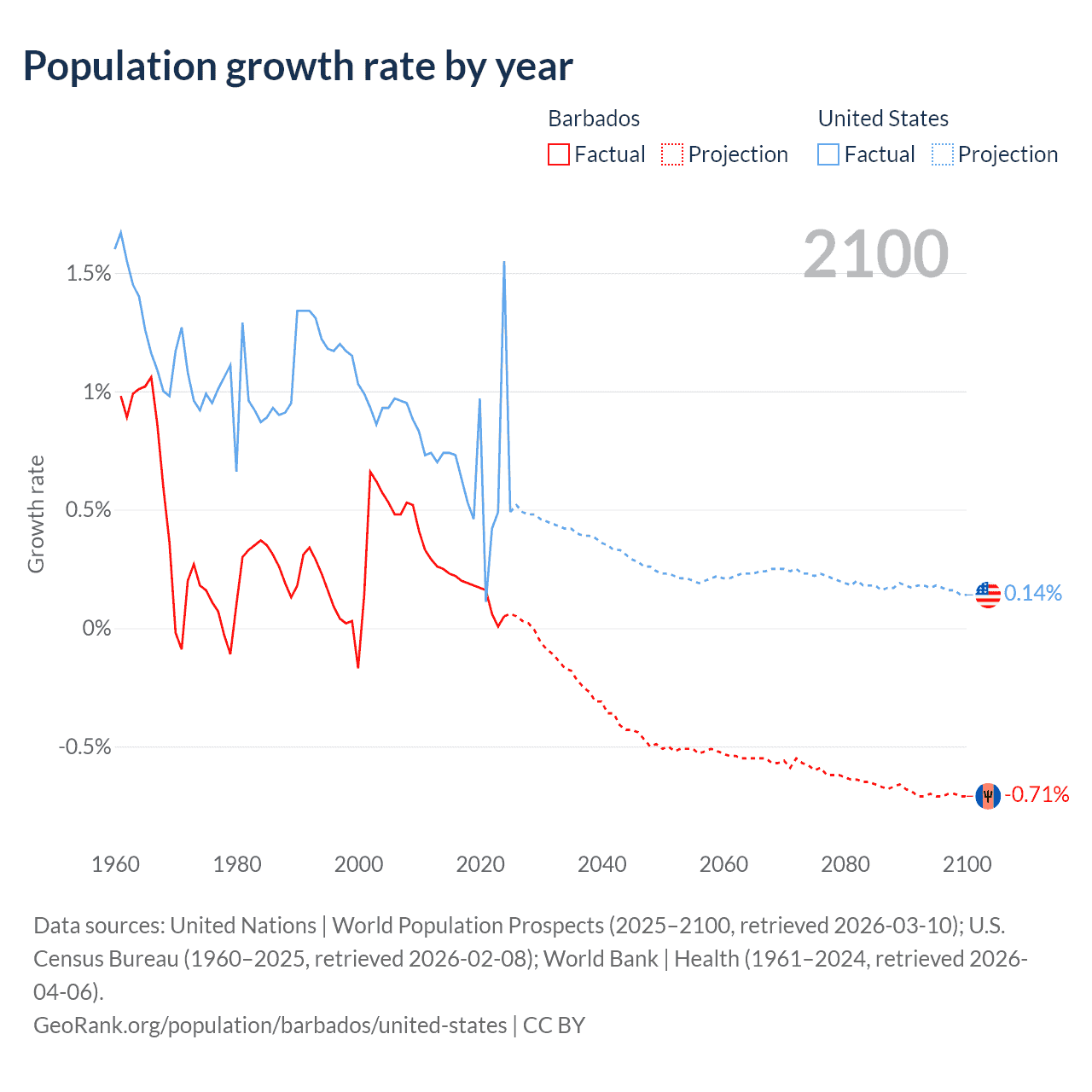 - For the last 10 years, Barbados has had an average growth rate of +0.16% per year vs +0.65% in the United States.