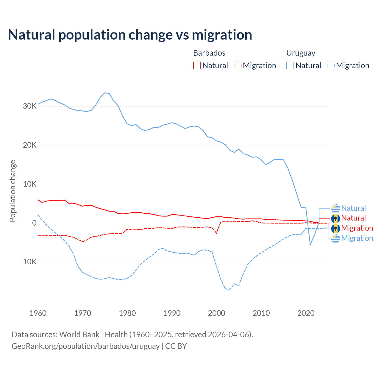 Over the last 10 years, 89.5% of the population change in Barbados is from natural causes (a gain of 4,936 people) and 10.5% is from migration (a loss of 578 people). In Uruguay 70% is from natural causes (a gain of 64,303 people) and 30% is from migration (a loss of 27,501 people).