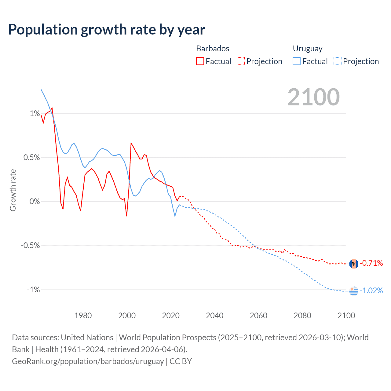 - For the last 10 years, Barbados has had an average growth rate of +0.16% per year vs +0.11% in Uruguay.