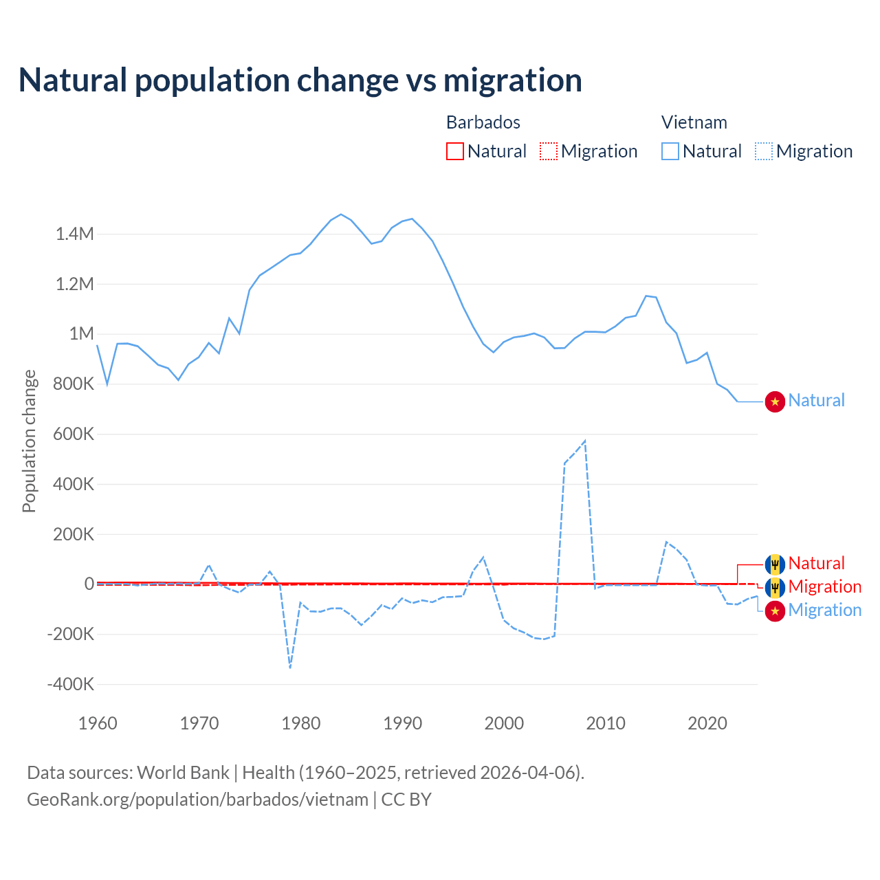 Over the last 10 years, 89.5% of the population change in Barbados is from natural causes (a gain of 4,936 people) and 10.5% is from migration (a loss of 578 people). In Vietnam 97.7% is from natural causes (a gain of 9,349,756 people) and 2.29% is from migration (a gain of 219,073 people).
