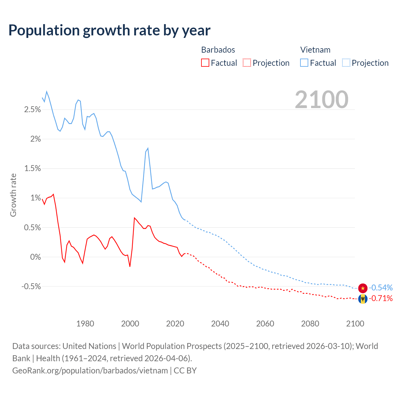 - For the last 10 years, Barbados has had an average growth rate of +0.16% per year vs +0.99% in Vietnam.