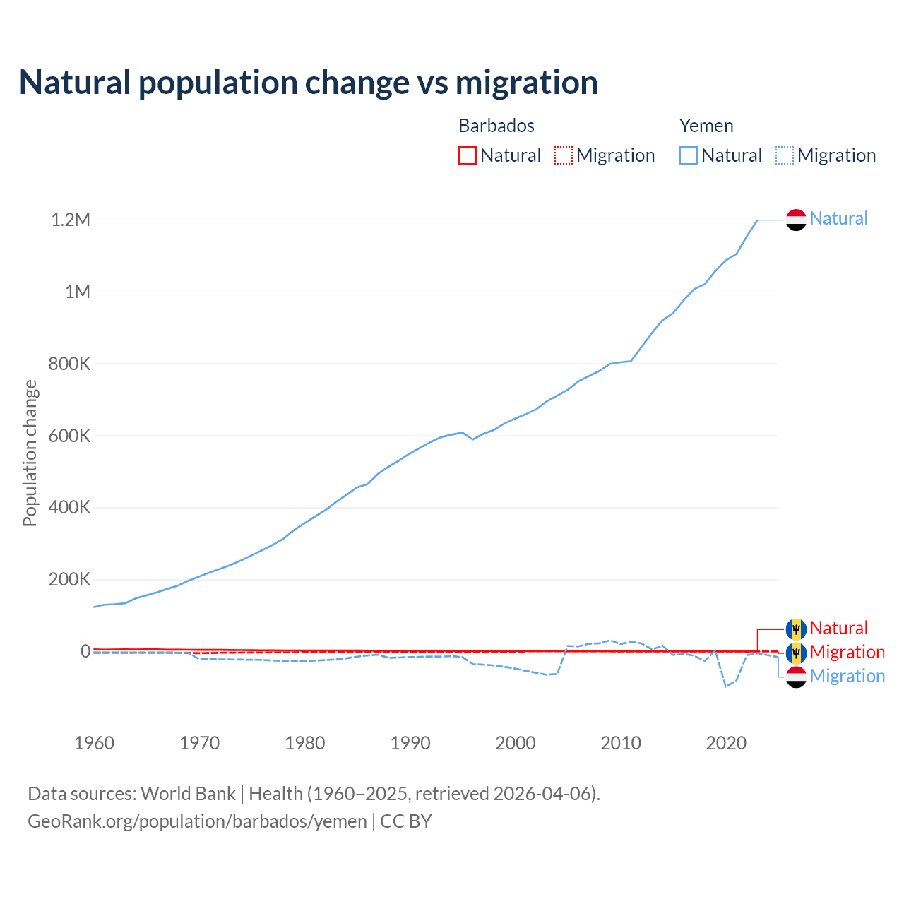 Over the last 10 years, 89.5% of the population change in Barbados is from natural causes (a gain of 4,936 people) and 10.5% is from migration (a loss of 578 people). In Yemen 97.8% is from natural causes (a gain of 10,460,813 people) and 2.17% is from migration (a loss of 231,814 people).