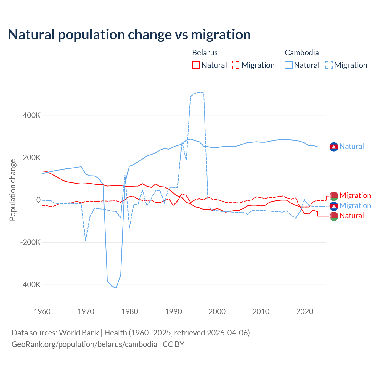 - Since 2006, the population of Belarus has decreased from 9.6M people to 9.01M (6.15% decline), while Cambodia has grown from 13.6M to 18.1M (32.8% growth).