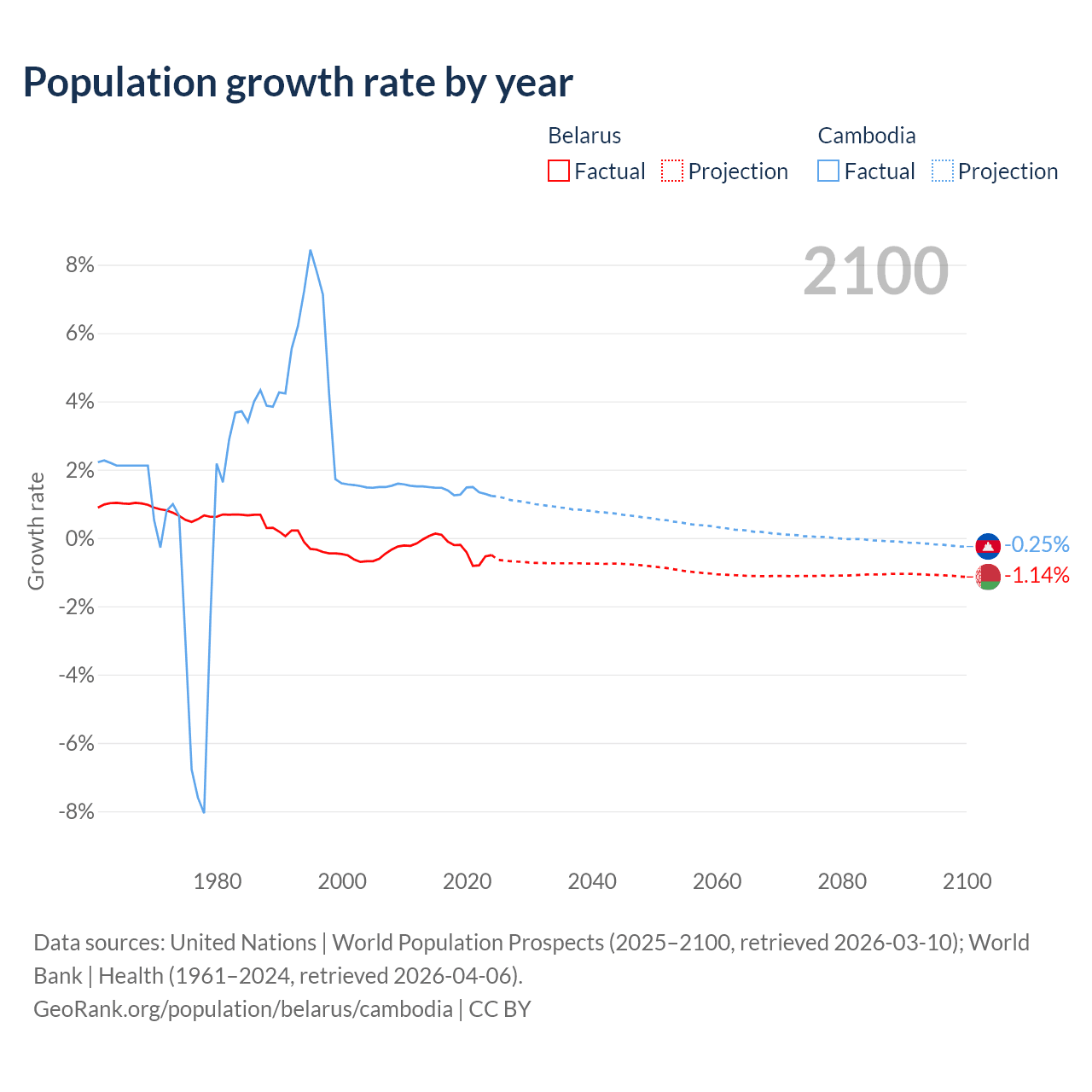 - For the last 10 years, Belarus has had an average growth rate of -0.3% per year vs +1.38% in Cambodia.