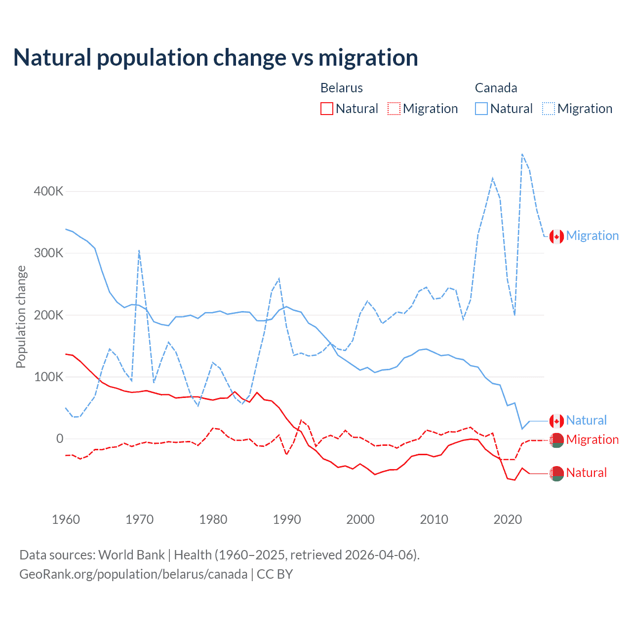Over the last 10 years, 84.2% of the population change in Belarus is from natural causes (a loss of 318,682 people) and 15.8% is from migration (a loss of 59,605 people). In Canada 19.4% is from natural causes (a gain of 789,345 people) and 80.6% is from migration (a gain of 3,276,554 people).