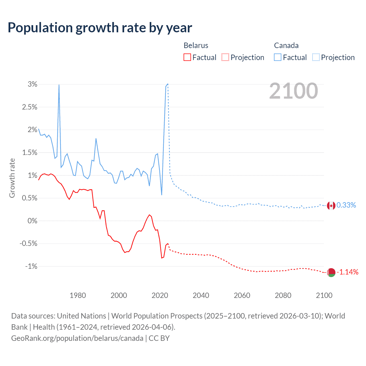 - For the last 10 years, Belarus has had an average growth rate of -0.3% per year vs +1.5% in Canada.