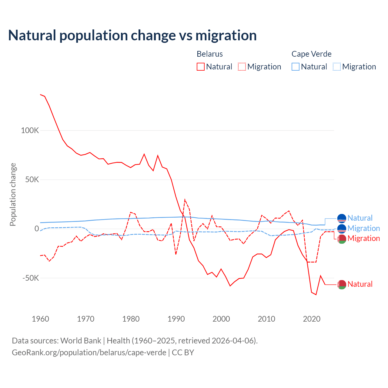 Over the last 10 years, 84.2% of the population change in Belarus is from natural causes (a loss of 318,682 people) and 15.8% is from migration (a loss of 59,605 people). In Cape Verde 56.4% is from natural causes (a gain of 50,193 people) and 43.6% is from migration (a loss of 38,879 people).