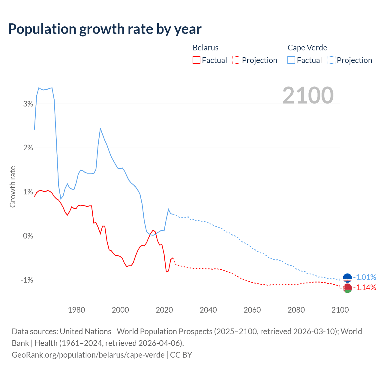 - For the last 10 years, Belarus has had an average growth rate of -0.3% per year vs +0.22% in Cape Verde.