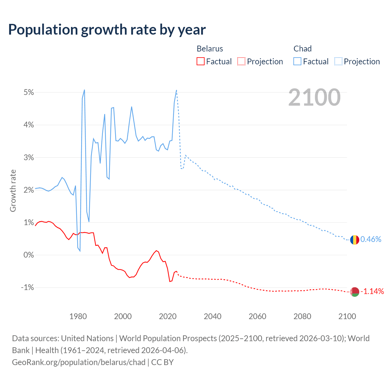 - For the last 10 years, Belarus has had an average growth rate of -0.3% per year vs +3.65% in Chad.