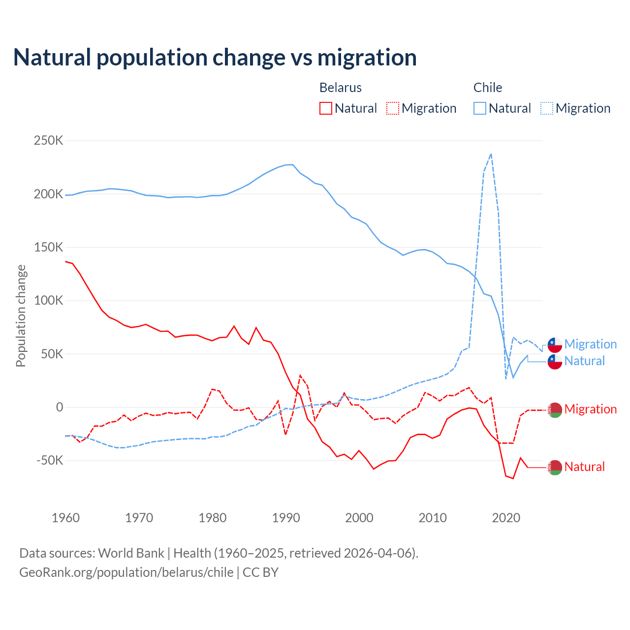 Over the last 10 years, 84.2% of the population change in Belarus is from natural causes (a loss of 318,682 people) and 15.8% is from migration (a loss of 59,605 people). In Chile 43.5% is from natural causes (a gain of 844,683 people) and 56.5% is from migration (a gain of 1,097,597 people).