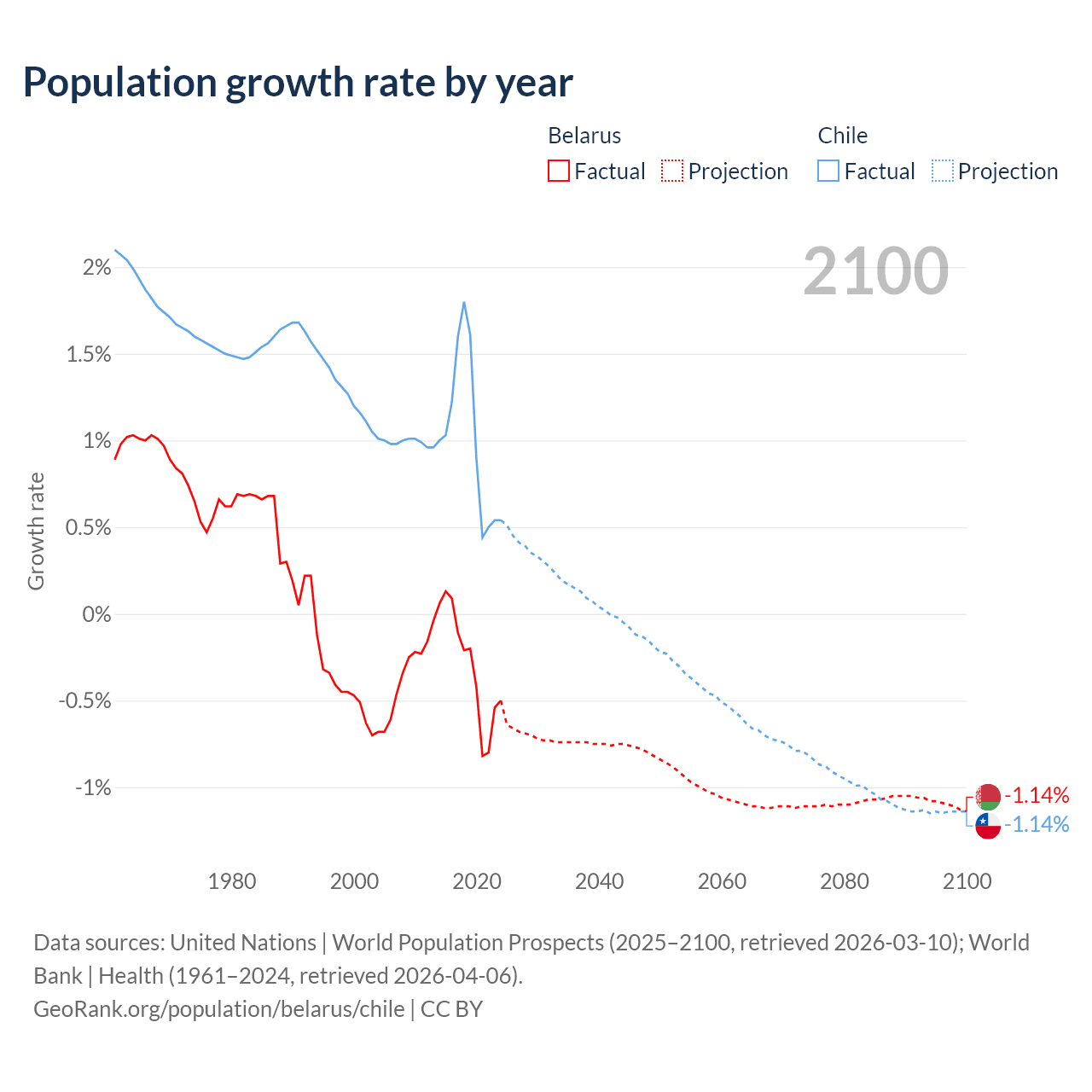- For the last 10 years, Belarus has had an average growth rate of -0.3% per year vs +1.02% in Chile.